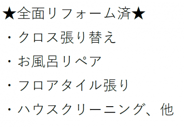 | 設備条件/設備備考 | 仲介手数料ゼロ / 駐車場有り / 値下げ物件 / リフォーム済 / ガス(集中プロパン) / |