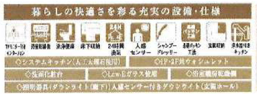 | 設備条件/設備備考 | 仲介手数料ゼロ / システムキッチン / 対面キッチン / 浄水器 / 追い炊き / トイレ2ケ所 / バス1坪以上 / シャンプードレッサー / 洗浄便座 / 浴室乾燥機 / 24時間換気システム / 床下収納 / ウォークインクローゼット / TVドアホン付き / 複層ガラス・防犯ガラス / 駐車場有り / 2台目駐車場 / フラット35 / ガス(都市ガス) / |